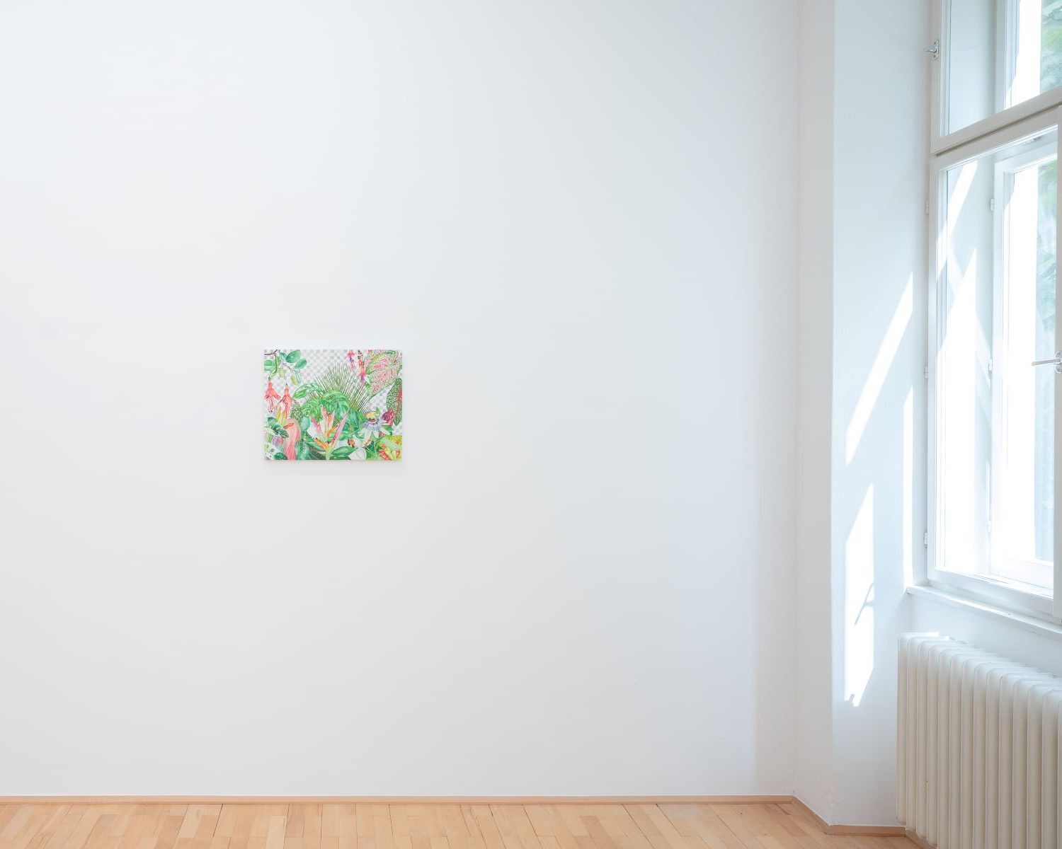 Die hellen Galerieräume zwischen den vollen Baumkronen der Franz-Josef-Straße vermitteln zugleich Leichtigkeit und Sterilität – ein Kontrast, der sich auch in Binders Arbeiten findet. Auf den ersten Blick wirken die floralen Muster dekorativ, irritieren jedoch beim näheren Hinsehen: Geometrische Formen, Maschinen, römische Ziffern treten zutage. Die Pflanzen erscheinen hyperrealistisch, in leuchtenden Aquarellschichten, scharf voneinander abgegrenzt und von grafischer Präzision.