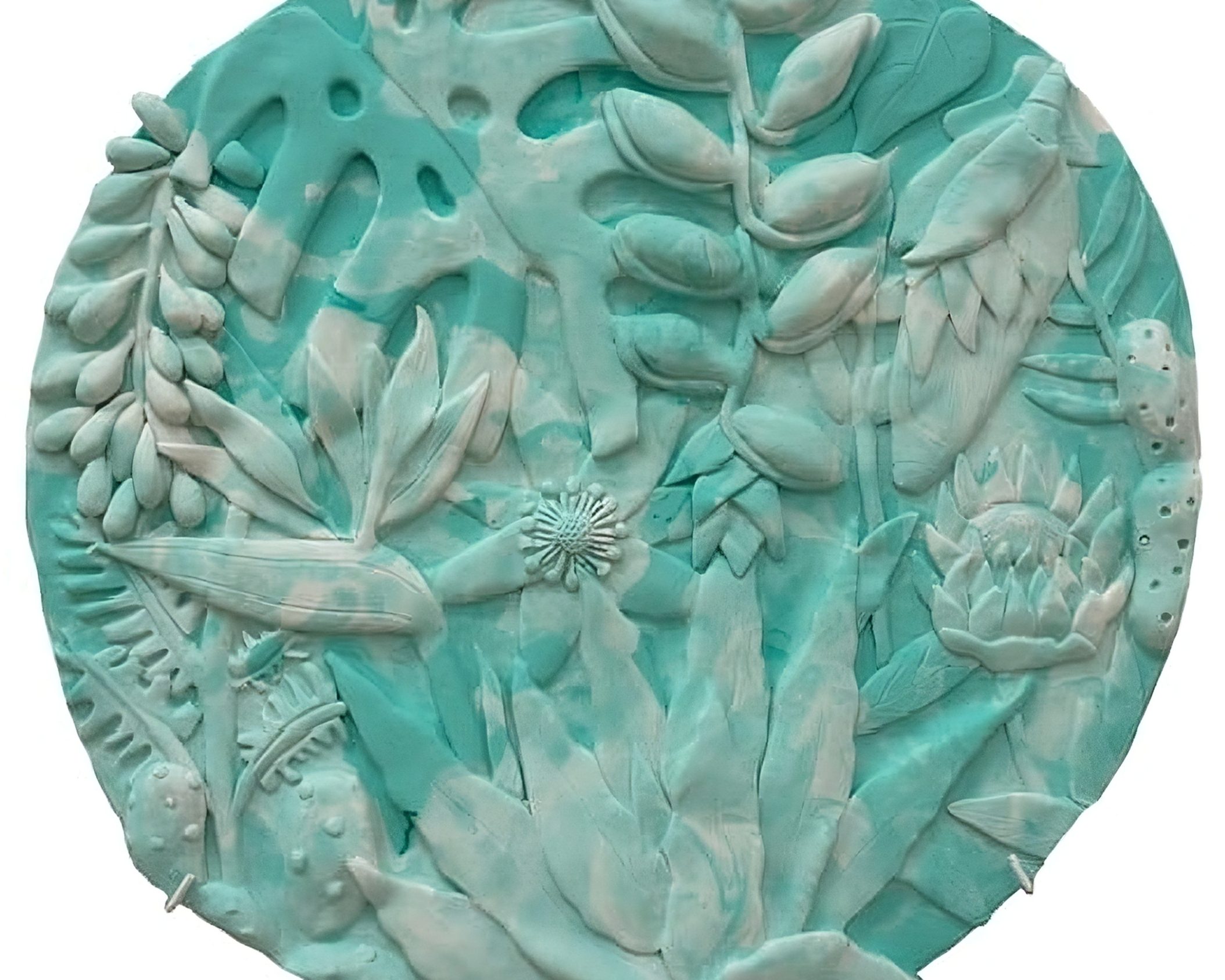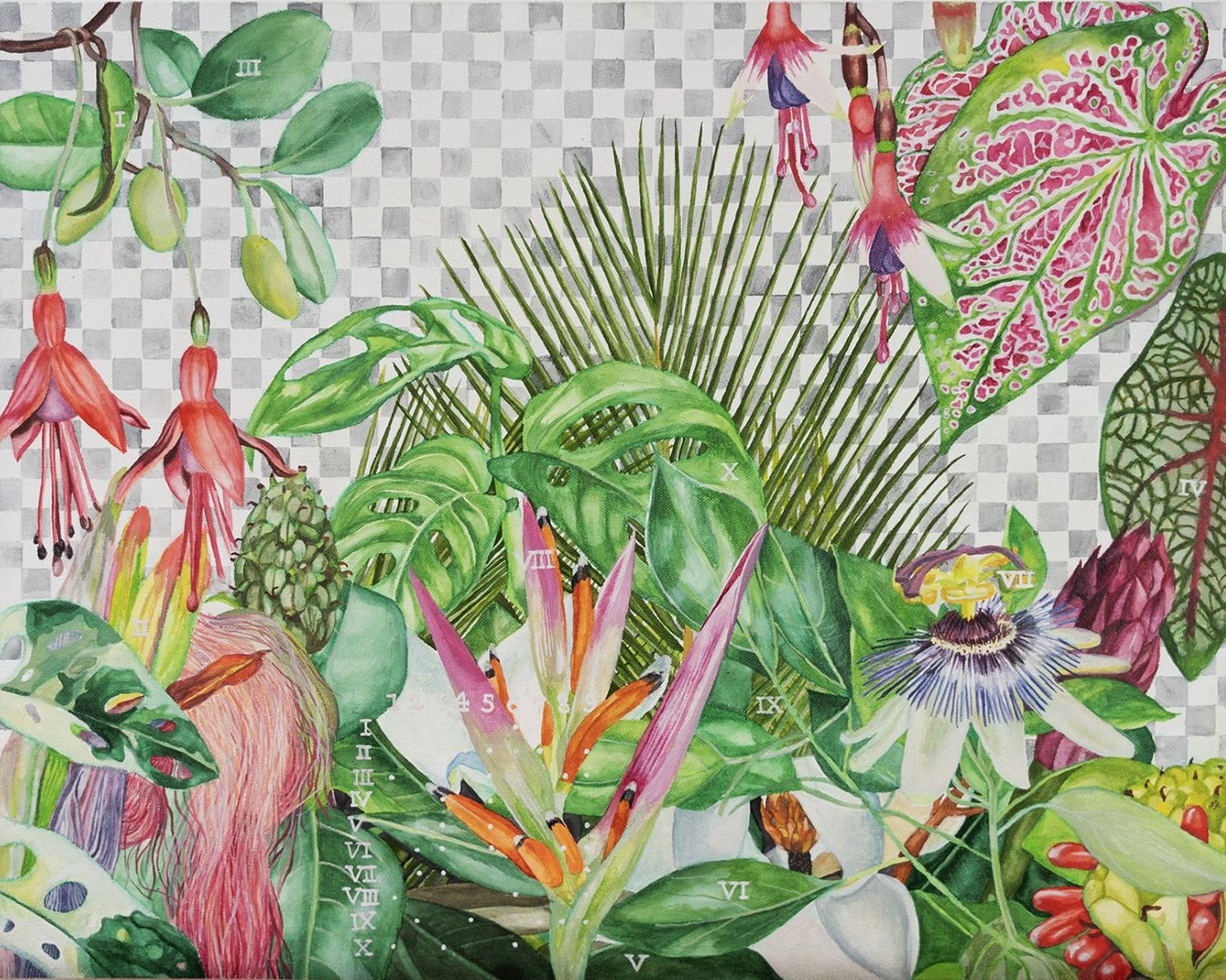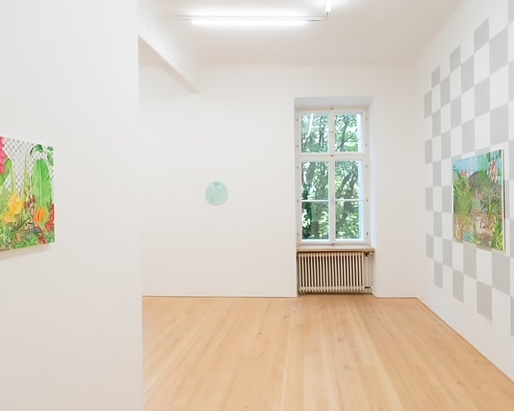 Die Galerie Sophia Vonier präsentiert Werke von Johanna Binder unter dem Titel „Earth Makers“. Gezeigt werden Aquarellmalereien sowie Reliefs aus Kunstharz, auf denen sich tropische Pflanzen ranken. Die Illusion von Natürlichkeit kippt sofort: Hinter sattem Grün und üppigen Blüten liegt ein grau-weißes Schachbrettmuster, wie man es aus Photoshop kennt – ein Symbol digitaler Bildproduktion