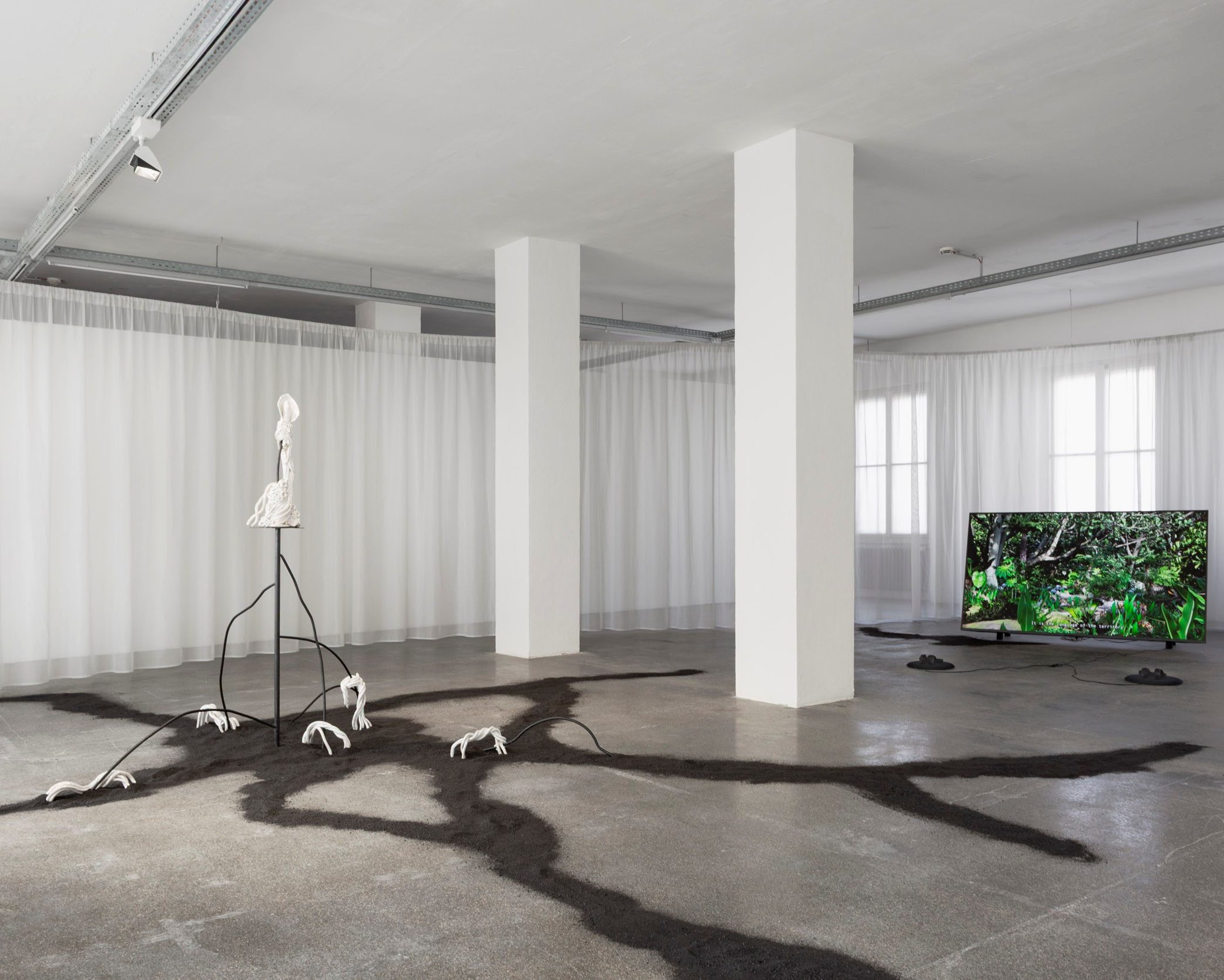 Through a semi-translucent white curtain that encircles the presentation, vertical forms are noticeable, yet not fully readable. Visiting the exhibition alone, and being the only visitor at the time, the experience felt cradled and controlled — it stirred ontological turmoil while seducing the senses. Beyond this flimsy barrier, simultaneously protective and inviting, the show comes fully into view: The vertical installations comprise a resin tondo composition of different plants, perched on a black rod at eye level (Untitled, 2025), and Talking Land (2025) that combines glazed ceramic forms and rods, which appears to be taking shape before one’s eyes. Set diagonally from them, a floor-set TV screen with two headphones plays a three-part video, Ascension: Blossoms of Power (2025) presenting the history of the island and giving voice to plants. Strewn across the floor and around the installations are heaps of black earth, a segment whose material presence evokes the idea of terra nullius[1].