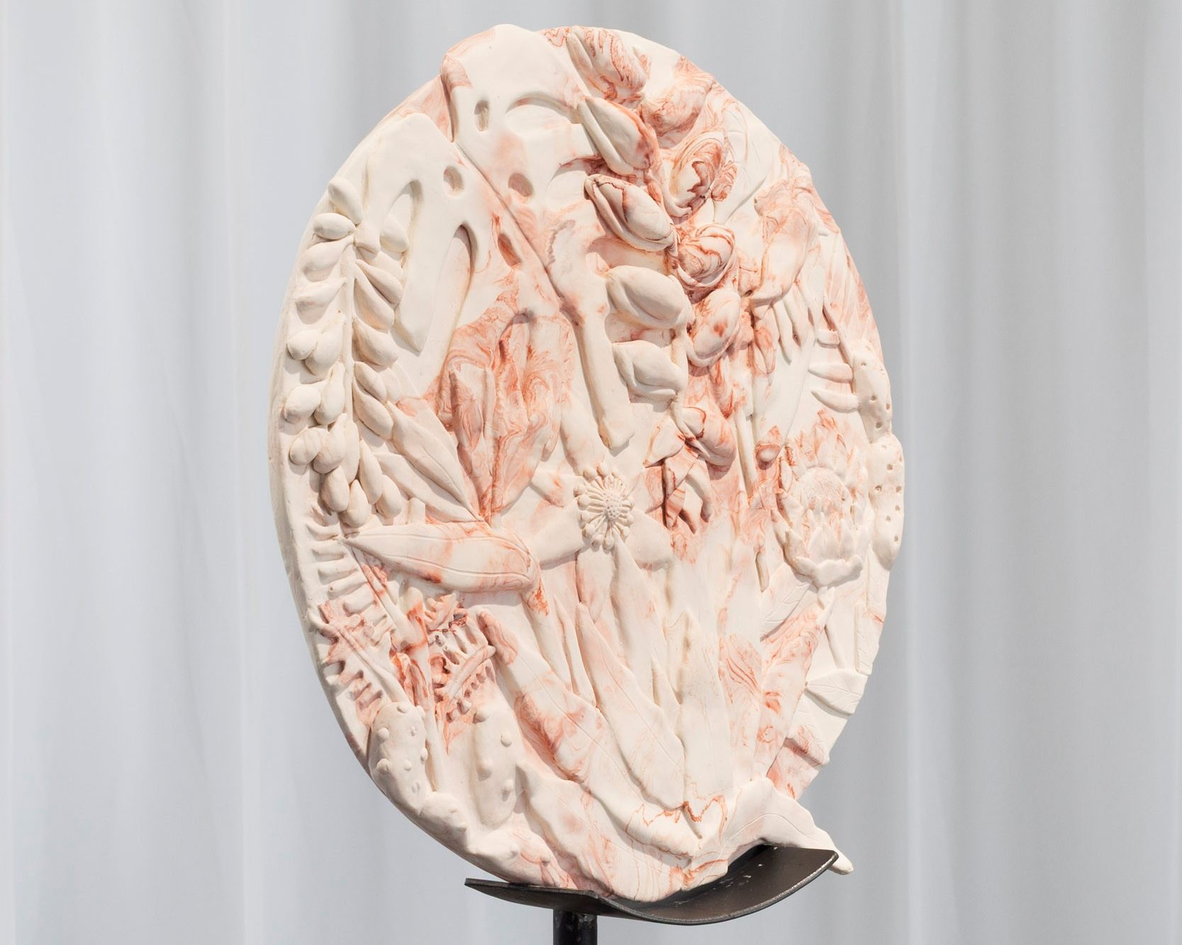 Suddenly, the tondo, a form that celebrated human figures, religious topics, and historical events (e.g. Michelangelo’s Taddei Tondo, 1504-1506), becomes more than a decorative depiction of plants. Crammed together and vying for attention, these plants usurp anthropocentrism and its traditional iconography. Here, they become new agents. This idea expands further in the Talking Land piece. Emerging from the ground and reaching upward, intertwined at the top and culminating in a formation that recalls both the Anthurium flower and a phallic shape, the glossy ceramic elements merge with the black rods to form a new organism. It is an epistemological overhaul, plants as new agents of knowledge, overwriting that produced by humans — it is a new process of othering and coming into being through entanglements with our histories rooted in masculinist expansionism and entrenched ontologies.