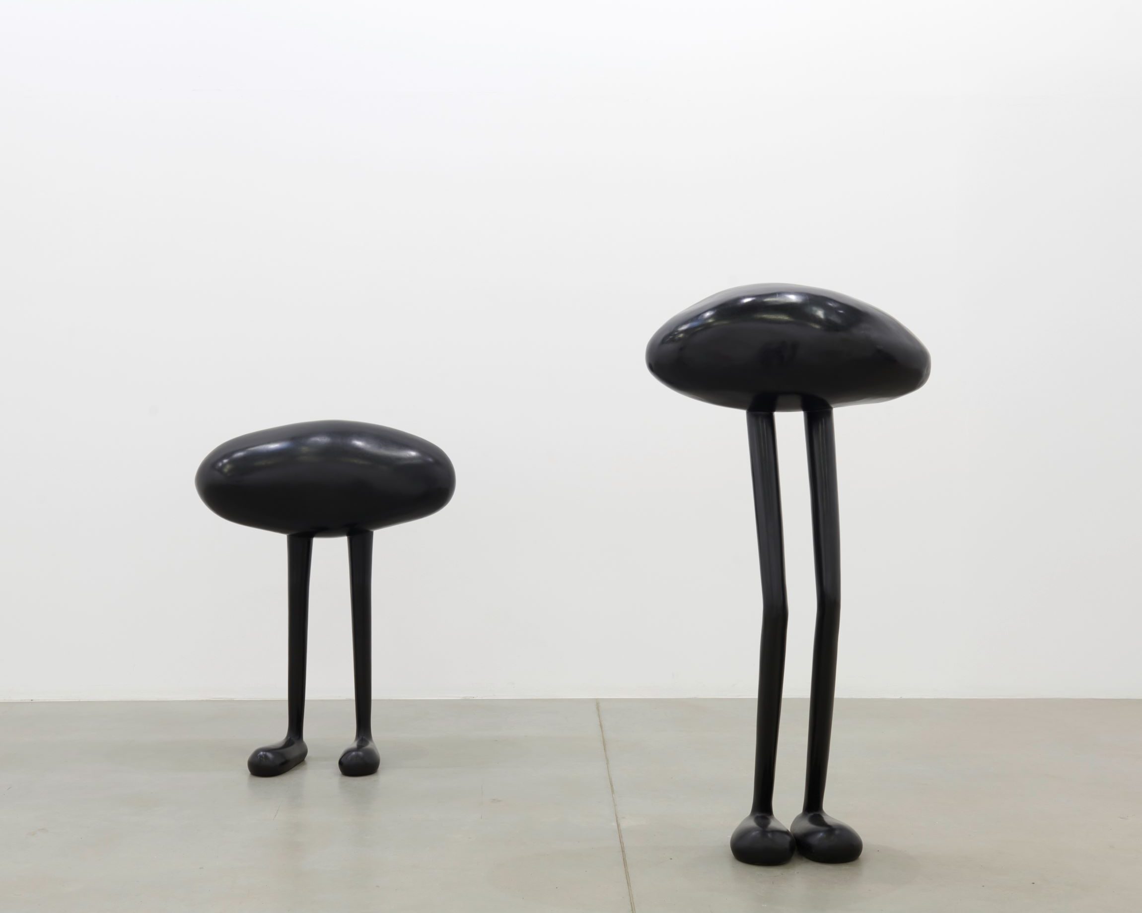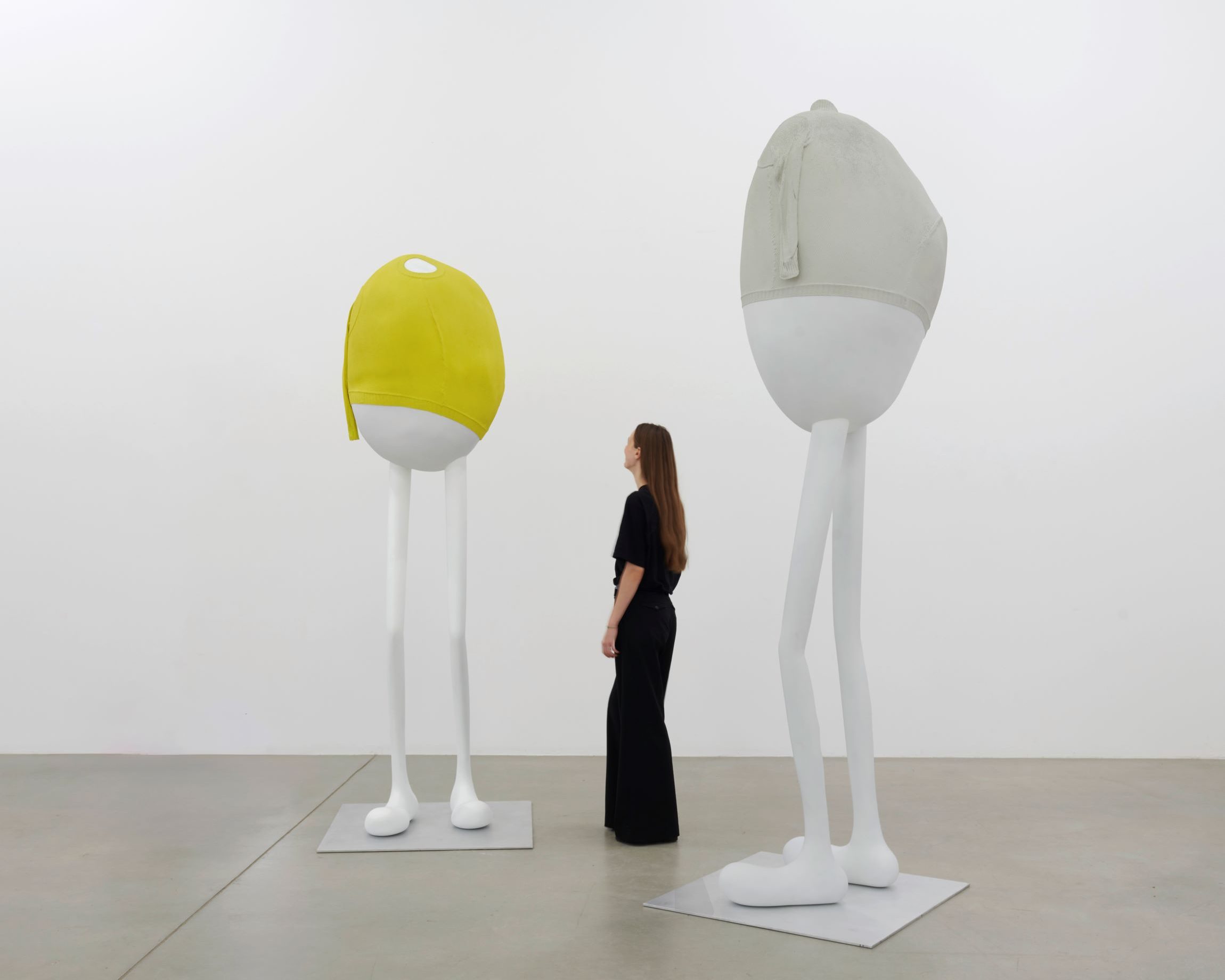 In fact, the surrealistic approach to figuration inherent in Wurm’s practice, surely charming at times, does not deliver on its own promise and always crumbles when related to real life parameters, which are everything but pink blobs with legs and oversized pickles (although the latter never cease to be, at least, humorous and almost tautologically funny). The sculptures neither relate to the human body nor to its surrounding; all they seem to do, is relate to a constructed reality, made to seem like a real one in favour of blindsiding the audience into believing that irony, propagated over a long period of time, suddenly turns into truth. Wurm’s newest sculptures, however, are, if anything, a testament to the power of momentary jokes, a faint pat on the back from a witty sense of humour with an uncertain future. Works like Tall Gray (Mind Bubbles) (2024) are plays on form, quite ingenuous and expertly crafted ones at that, but certainly not a way into our own, supposedly repressed or almost forgotten psychic world.