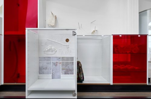 In der ‚Ouvertüre‘ (um bei der musikalischen Metapher zu bleiben) arbeitet sie mit dem in der Ausstellungsdramaturgie gerne eingesetzten Gefühl der „Glory“ – der Erhabenheit: Auf einem raumgreifenden Podest sind zwei eindrucksvolle Kostüme (nebst Kleinmöbeln) aus ihren Performances wie in einem Theatermuseum präsentiert. Da das Podest auf Abstandhaltern einige Zentimeter über dem Boden schwebt, wirken die gezeigten Exponate intuitiv ‚erhaben‘ und somit wertvoll, einzigartig, begehrenswert. Ein überdimensioniertes Set-Foto lässt alles noch größer erscheinen – und macht uns gleichzeitig kleiner. Auf derartige Größe reduziert betreten wir also eine andere Welt, die uns Staunen und Bewunderung abverlangt. Dass die an der zweiten Wand gezeigte Videoprojektion relativ klein und ohne theatralische Kraft geraten ist, stört diese Empfindungen. Positiv fällt jedoch die durchgängige Verwendung eng abstrahlender Richtlautsprecher auf, was akustische Störungen trotz schallreflektierender Räume vermeidet und Konzentration ermöglicht.