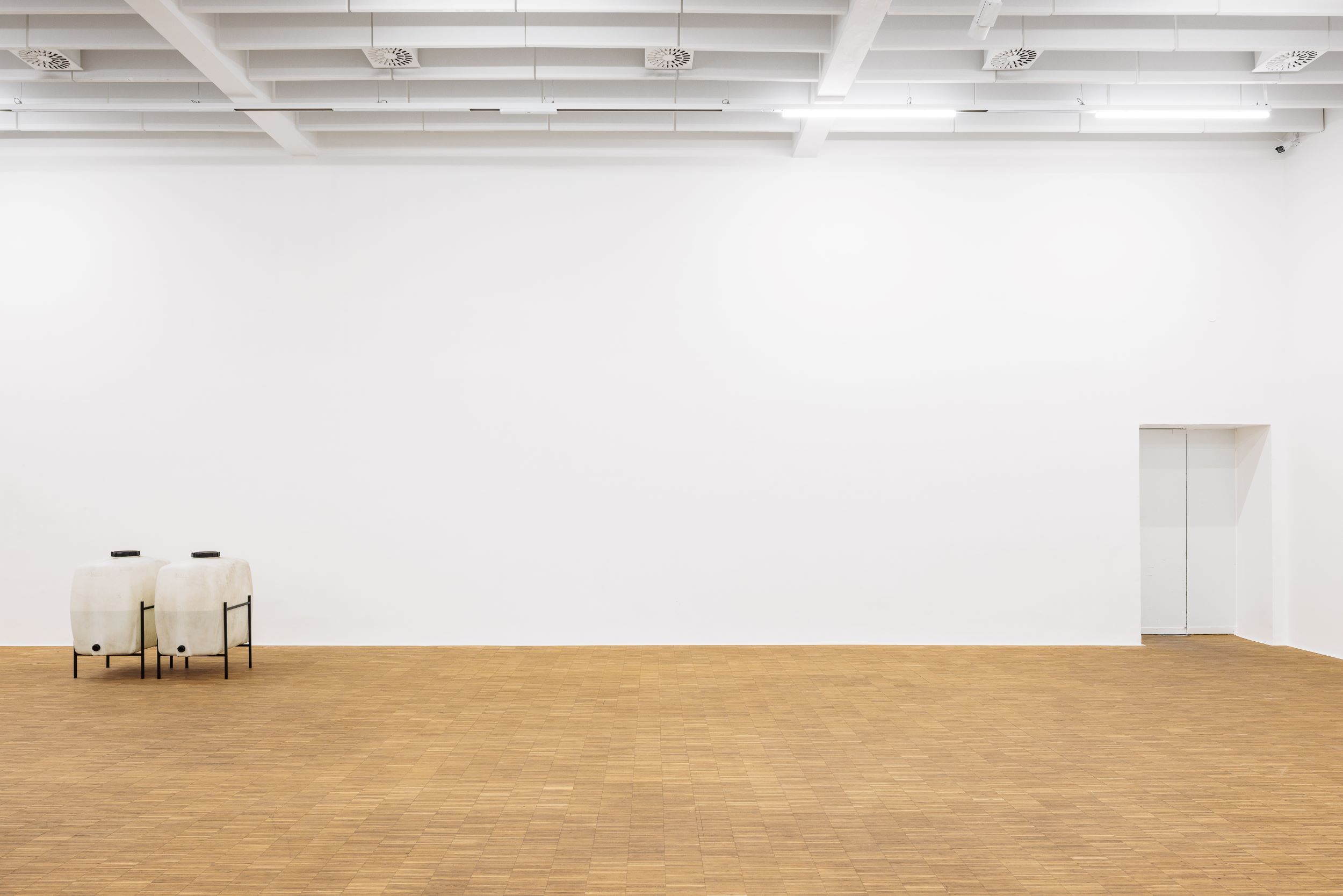 Martin Sommer präsentiert mit L.C. (2025) zwei Kunststoffbehälter, die mit einer Flüssigkeit auf Basis von Lithiumcarbonat gefüllt sind. Das Lithium stammt aus Batterien, die ursprünglich zur Regulierung energetischer Prozesse in technischen Systemen entwickelt wurden. Durch ein mehrstufiges chemisches Verfahren isolierte Sommer das Lithium und transformierte es in eine medizinisch nutzbare Lithiumcarbonatlösung. Mitte des 20. Jahrhunderts wurde Lithium als Mittel zur affektiven Stabilisierung Teil der entstehenden Psychopharmakologie. Einst Regulator für energetische Maschinenprozesse, birgt die Substanz nun das Vermögen, menschliche Stimmungen zu stabilisieren. Der Sprung von der technischen zur psychischen Regulation findet in eben jener materiellen Transformation statt. Die Kanister bleiben aber verschlossen – die Lösung existiert so als latentes Potenzial, das auf seine Verwendung beziehungsweise Aktivierung wartet. Diese hochtechnische Transformation ist gleichzeitig eine poetische Geste. Die Arbeit beruht auf der Erkenntnis, dass Dinge über Verwandtschaften verfügen und in miteinander korrelierenden Systemen zusammenhängen, auch wenn sie zunächst fremd und isoliert wirken. Sommers künstlerische Praxis begreift Materialien und Gegenstände nicht als abgeschlossene Einheiten, sondern als zu einem bestimmten Zeitpunkt in einer bestimmten Form gebundene Zustände, die ihre Erscheinung jederzeit ändern können. Ausgehend von recycelten und vorgefundenen Materialien öffnet er Bedeutungsfelder, die durch deren transformativen Kapazitäten entstehen. Die Arbeit situiert sich im Zwischenraum verschiedener Aggregatzustände, Funktionen und symbolischen Ordnungen, also an eben jenen Orten, an denen Transformation stattfindet.