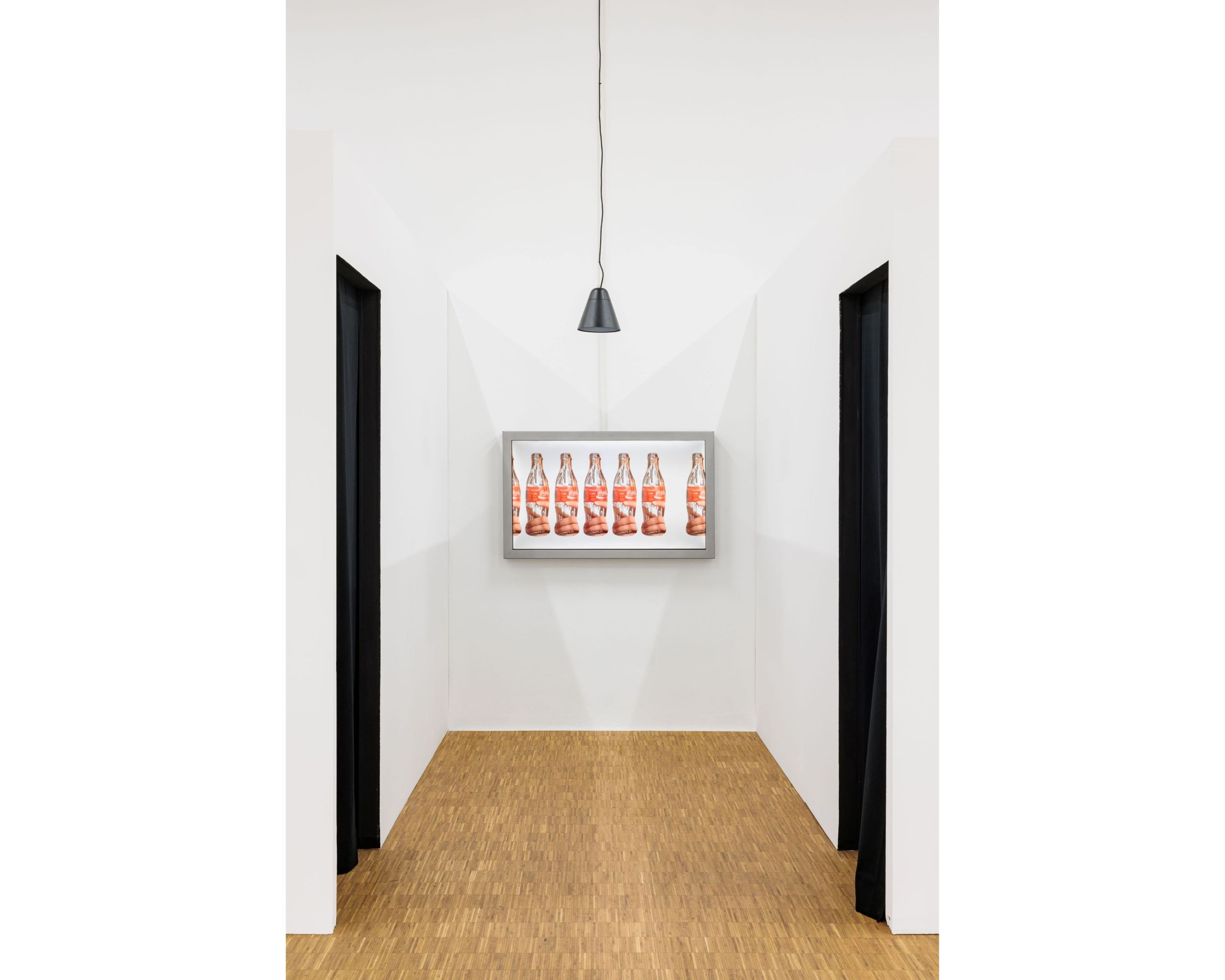 Manuel Tozzi präsentiert eine animierte Videoarbeit, die eine Cola-Flasche vor weißem Hintergrund zeigt. Die Arbeit basiert auf Found-Footage-Material der Pornodarstellerin Natalia Trotskaia, in dem die Glasflasche als erotisches Objekt eingesetzt wird. Tozzis Animation verbirgt den gesamten Kontext des originalen Videos, sodass nur die Flasche sichtbar bleibt, die durch einen weißen Rahmen isoliert wird. Sie verharrt stets in der Bildmitte und jede Bewegung führt sie dorthin zurück. Selbst wenn sie kippt, gedreht wird oder vorübergehend aus dem Bildausschnitt verschwindet – etwa im Mund der Darstellerin – bleibt sie bis auf einzelne Fehlstellen das einzig sichtbare Element. Die Cola-Flasche wird zum Brennpunkt zweier verschränkter Begehrensstrukturen, der pornografischen und der konsumistischen. Pornografie organisiert den Blick auf eine imaginierte Welt endloser Befriedigung: eine Pornotopie. Sie verspricht Erfüllung durch das Bild, erzeugt aber notwendigerweise Frustration durch ihre Medialität, was Begehren fortschreibt. Die Cola-Flasche, eine globale Ikone des Konsums, funktioniert nach demselben Prinzip: Sie verspricht Befriedigung und produziert als Konsumobjekt Mangel. Die Arbeit – hier in der Mitte der zentralperspektivischen Raumachse platziert – aktiviert eine Blickstruktur, die bis in die Renaissance zurückreicht. Der Blick in die Tiefe einer Landschaft fungierte dort als Substitut für den durch sexualmoralische Verbote verhinderten Blick auf den weiblichen Körper. Diese pornotopische Blickorganisation offenbart sich als heteronormative, patriarchale Struktur, die Tozzi mit neoliberaler Konsumlogik kurzschließt. Der Blick wird freigegeben und zugleich verstellt. Der gesamte Umraum bleibt offen für die Imagination der Betrachtenden und der male gaze gelangt nie an sein Ziel.