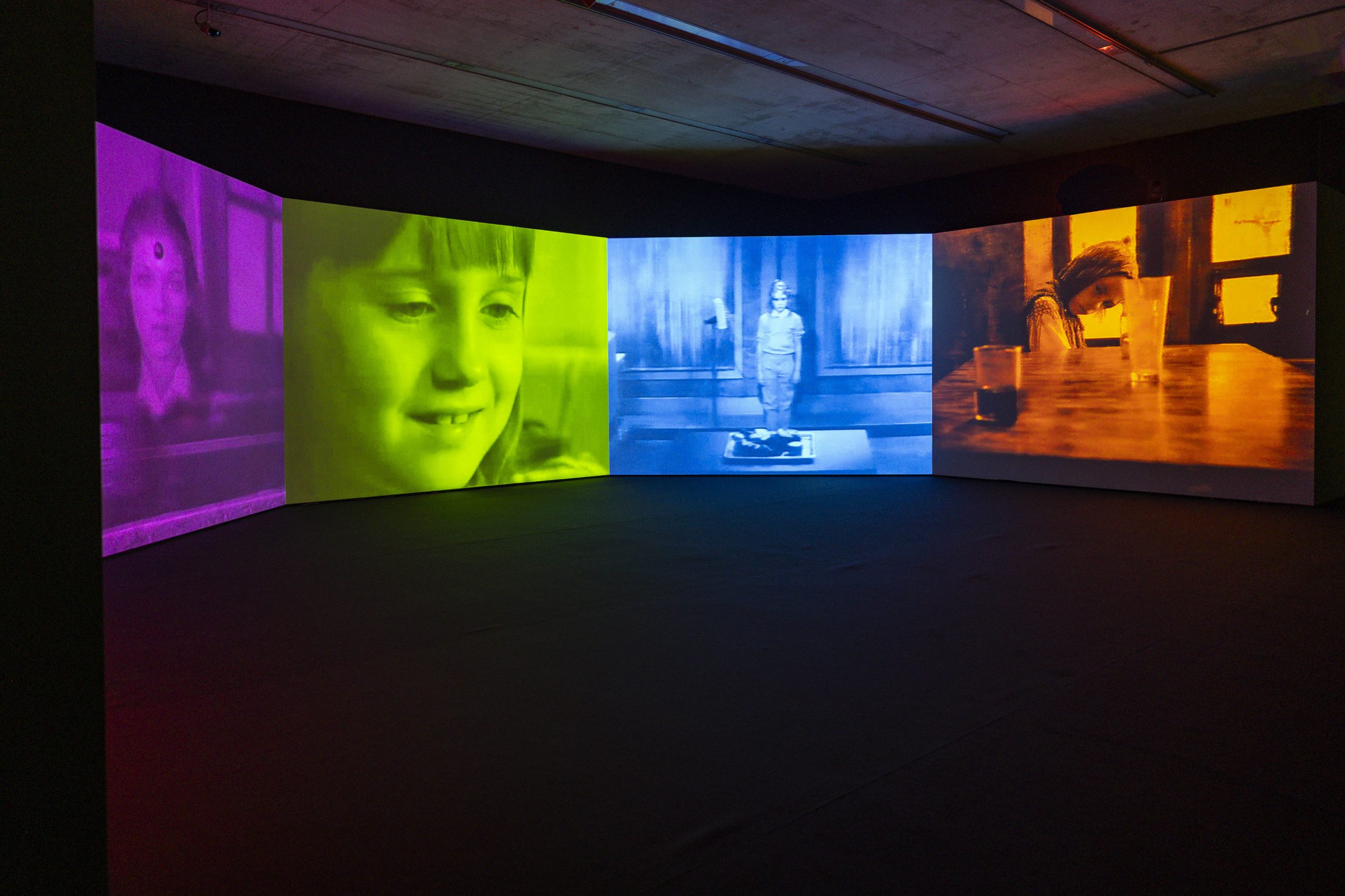 Schneller für das Auge wird es wieder bei Psi Girls (1999) von Susan Hiller. Im Raum sind fünf isolierte und veränderte Szenen aus Spielfilmen zu sehen, in denen Mädchen und junge Frauen durch reine Willenskraft Dinge bewegen. Es sind Ausschnitte aus dem kollektiven Bildergedächtnis des Kinos, darunter bekannte Filme wie Matilda (1996, Danny DeVito). Was im Spielfilm als kurzer Höhepunkt vorbeirauscht, wird hier zu einer Choreografie des Sehens: Farbe, Rhythmus und Synchronität verdichten Blicke, Gesten und Affekte. Das Bild des „mächtigen Mädchens“ schwankt zwischen Autorität und Verletzlichkeit, Kontrolle und Ekstase; stereotype Erzählungen über Weiblichkeit werden sichtbar und zugleich unterlaufen.