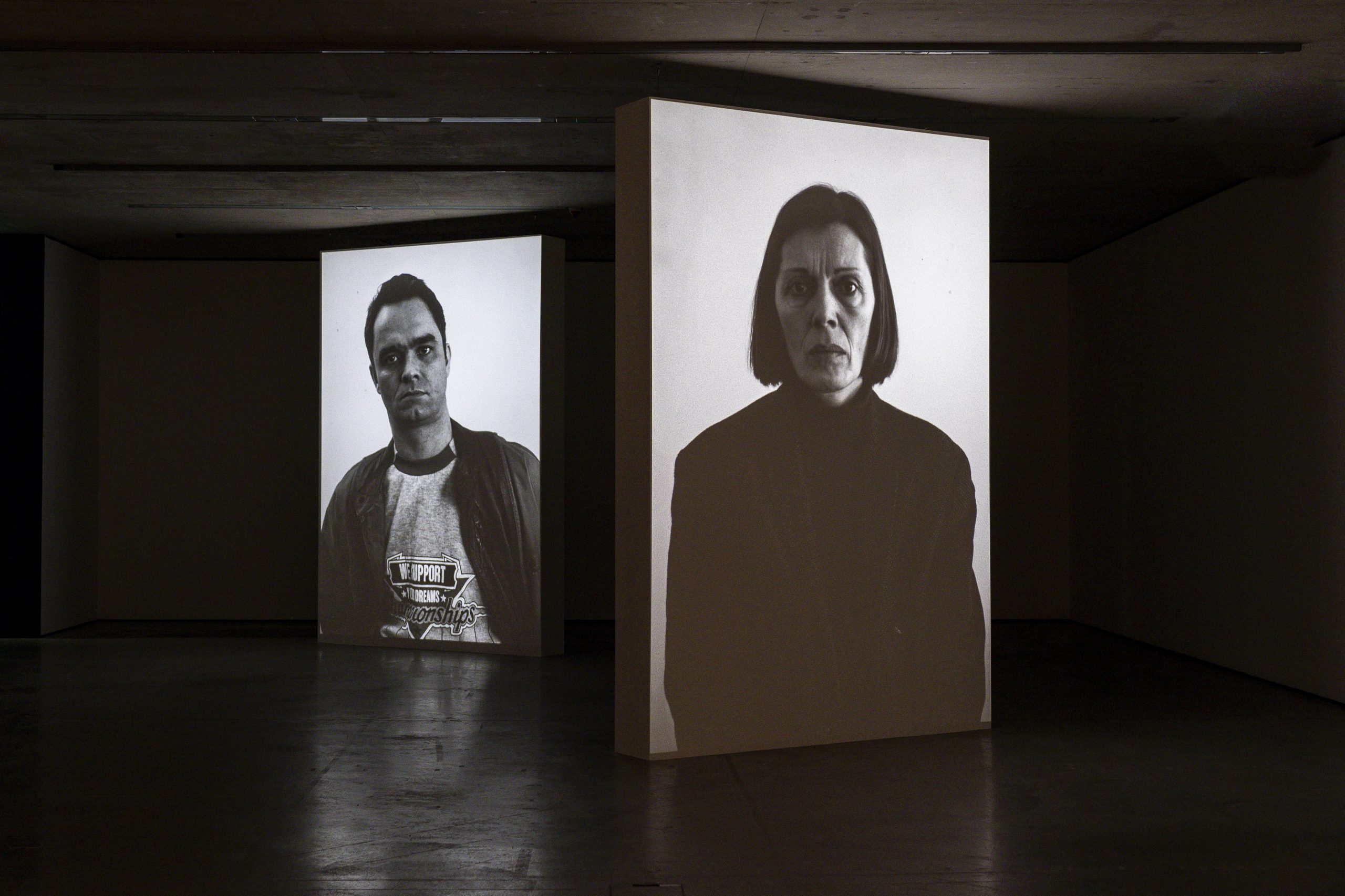 Ana Torfs untersucht den Bilderstrom auf andere Weise. Der Raum ist still, nur das Klackern des Dia-Projektors gibt einen rhythmischen Ton vor. Auf zwei großen Leinwänden blicken eine Frau und ein Mann frontal, ernst und unbeirrbar entgegen. Mit jedem Bild wechseln Kleidung, Frisur und Accessoires; Haltung und Blick bleiben gleich. So entstehen immer neue Rollenbilder, Identitäten und Beziehungskonstellationen. Man erkennt Vertrautes und merkt zugleich, wie sehr unsere Deutungen von kulturellen Mustern geprägt sind. Auf 14 Tischen liegen die ungebundenen Blätter eines „Buches im Entstehen“. Zusammen mit den Porträts bildet es ein offenes System von „Wahlverwandtschaften“, das Begriffe wie Wahrheit, Maske und Identität spielerisch und zugleich entschieden befragt.